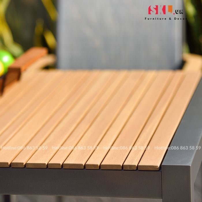 - Chất liệu: Khung nhôm sơn tĩnh điện màu đen, trắng hoặc xám, mặt bàn gỗ Teak sử lý sơn ngoài trời.