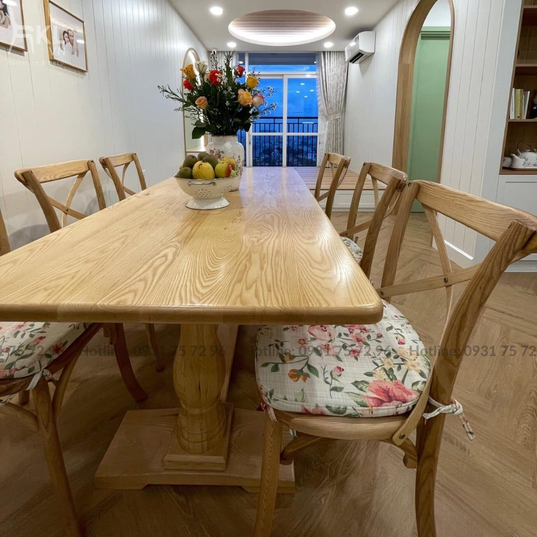 - Chất liệu: Ghế gỗ Ash tự nhiên sơn PU hoàn thiện bọc vải. Bàn khung gỗ Ash tự nhiên sơn PU hoàn thiện.