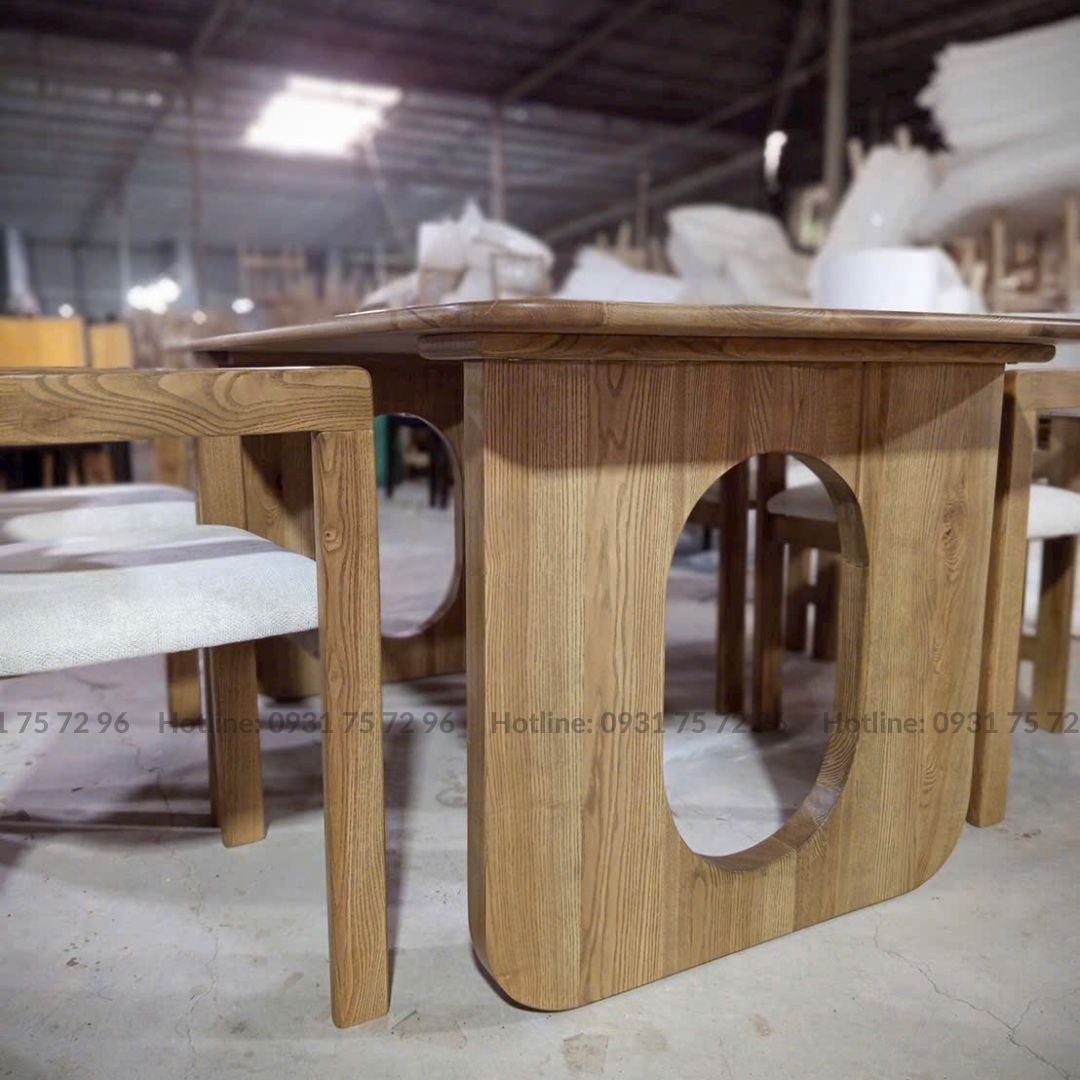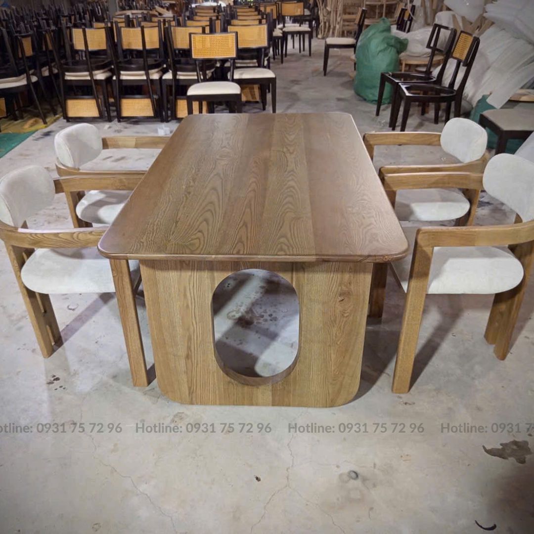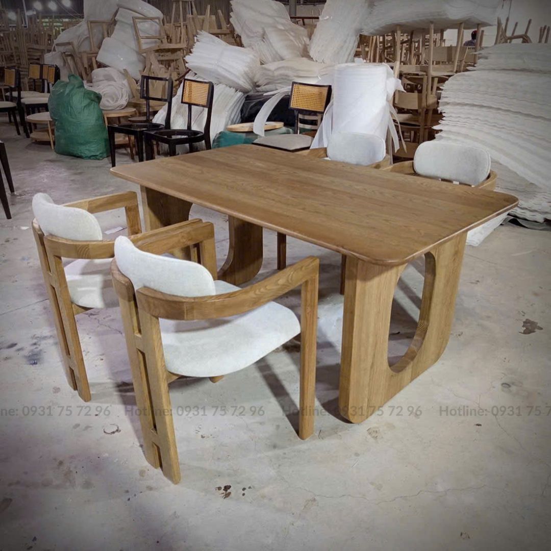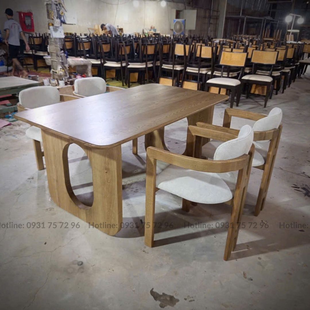 - Chất liệu: Ghế gỗ Ash tự nhiên sơn PU hoàn thiện bọc nệm ngồi bằng vải hoặc Simili. Bàn khung gỗ Ash tự nhiên sơn PU hoàn thiện.