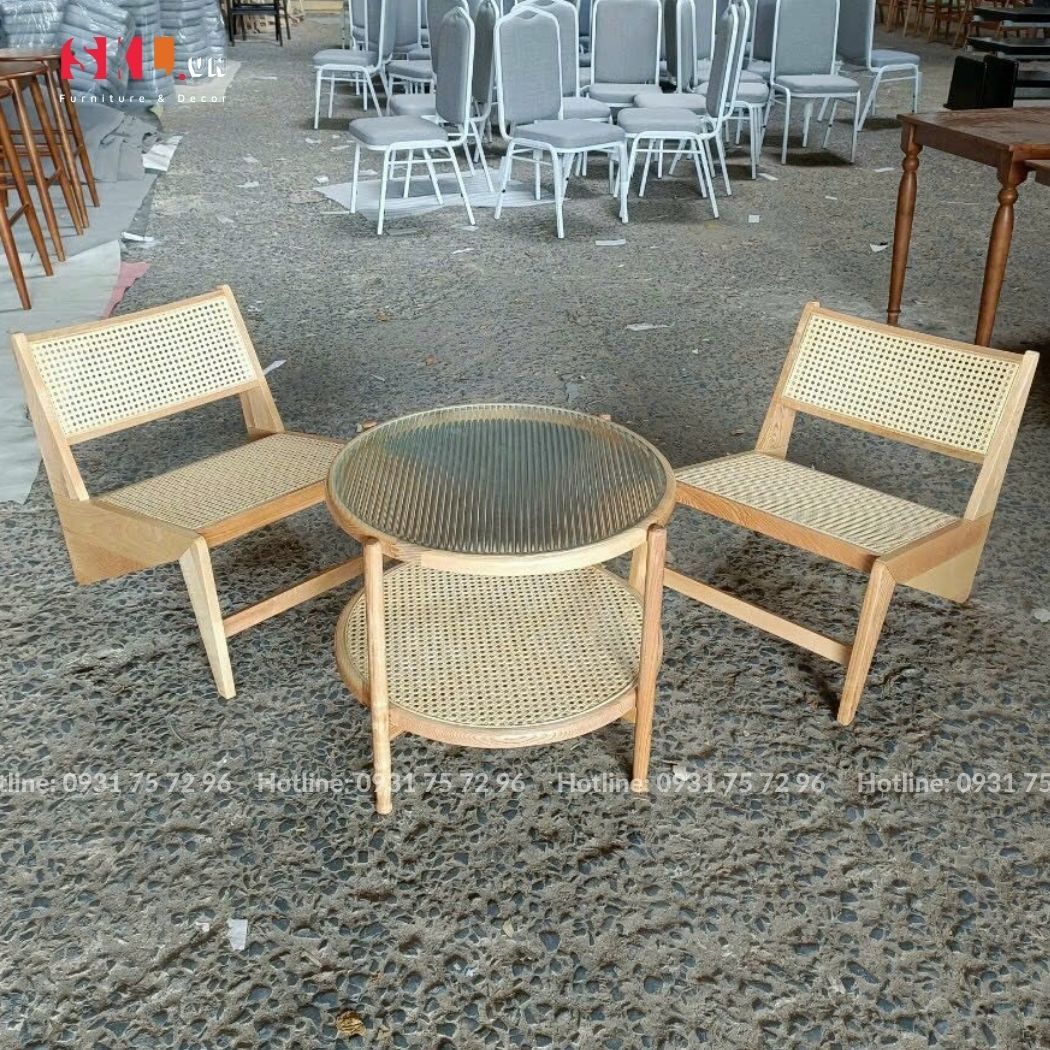 - Chất liệu: Khung gỗ Ash tự nhiên sơn PU hoàn thiện, lưng tựa và mê ngồi đan mây mắt cáo.