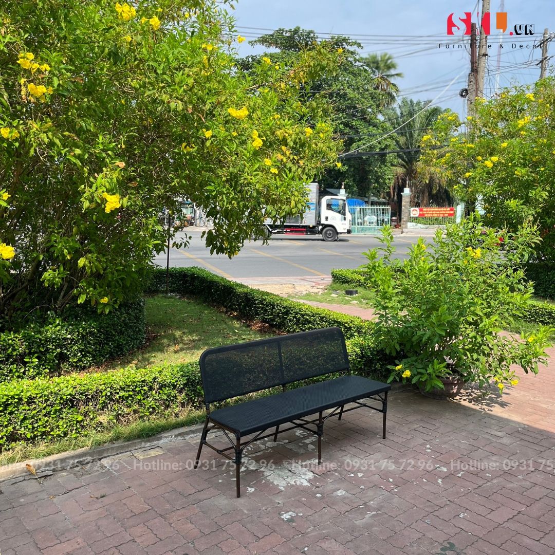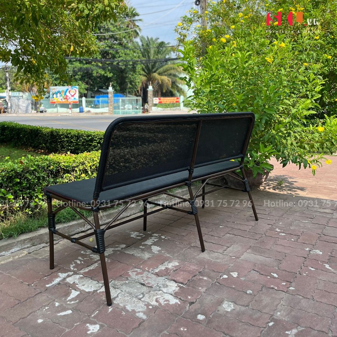 - Chất liệu: Thép mạ kẽm sơn tĩnh điện, hoàn thiện bọc vải lưới Textilene thoát nước nhanh, chống tia UV. Đan dây mây nhân tạo trang trí.
